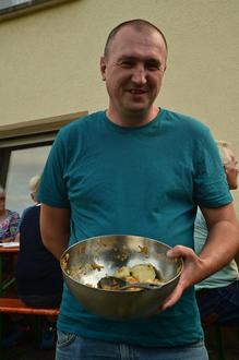 „Wir haben am Wochenende mehrere Stunden lang die ´Varenyki` vorbereitet“, schilderte Dima Ivanchuk (38), der Sprecher der ukrainischen Gruppe. Zu den Teigtaschen wurde auch noch ein leckerer Schichtsalat gereicht. „Eine bessere Nachbarschaft kann man sich gar nicht wünschen“, bilanzierte Dorothee Merzbacher, die „gute Seele“ der Integration in der Geißgasse. „Die Menschen sind herzlich, unkompliziert, herzlich und freundlich, besser geht es gar nicht“, freute sie sich. Auch Bürgermeister Hans Steinfelder lobte das Gelingen des integrativen Experiments in der Geißgasse. „Das sah im Vorfeld einmal ganz anders aus“, erinnerte er sich, angesichts vieler Befürchtungen, die vor dem Einzug der ukrainischen Geflüchteten bei so manchem Geißgassenbewohner virulent waren. Damals hatte das Landratsamt mit einem Gesprächstermin versucht, die Wogen zu glätten, als noch nicht klar war, wer in das Haus einziehen würde. Inzwischen besuchen die ukrainischen Erwachsenen mit gutem Erfolg ihre Deutschkurse, die Kinder sind im Kindergarten, in der Schule und in Sportvereinen gut integriert. Ortsbürger engagieren sich als Sprachenlehrer oder helfen den ukrainischen Schülerinnen und Schülern bei ihren Hausaufgaben.