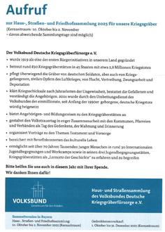 Die Haussammlung für die Deutsche Kriegsgräberfürsorge findet in der Zeit vom 10.10. bis 02.11.2025 statt.