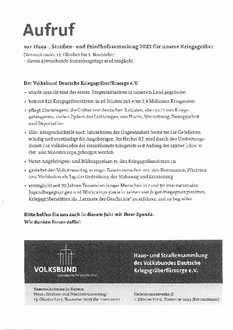 Die Haussammlung für die Deutsche Kriegsgräberfürsorge findet in der Zeit vom 13.10. bis 05.11.2023 statt.