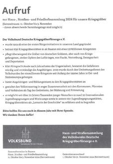 Die Haussammlung für die Deutsche Kriegsgräberfürsorge findet in der Zeit vom 11.10. bis 03.11.2024 statt.