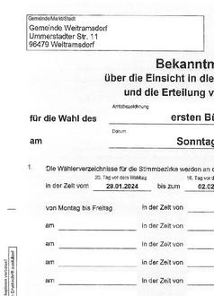 Bekanntmachung über die Einsicht in die Wählerverzeichnisse und die Erteilung von Wahlscheinen