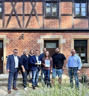 Haus Roth in Tambach – junges Wohnen in historischem Klinkerbau. Bei der Baukulturpreisübergabe am 18. September 2024: V.l.n.r: Herr Marco Ahles, Vorstandsassistent VR-Bank Lichtenfels-Ebern eG / Frau Nina Liebermann, Bürgermeisterin Gemeinde Itzgrund und Projektpatin Leitprojekt „Bauen und Wohnen“ Initiative Rodachtal / Frau Christine Bardin, Arbeitskreis Historische Bausubstanz der Initiative Rodachtal / Herr Martin Finzel, 1. Vorsitzender der Initiative Rodachtal e.V. und Bürgermeister der Gemeinde Ahorn, Herr Dieter Treubig, Beigeordneter der Stadt Heldburg / Preisträgerin Frau Christin Rothaug mit Partner Herr Tom Schelhorn / Herr Hans Steinfelder, Bürgermeister Weitramsdorf