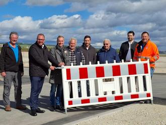 Sperrung aufgehoben: Wolfgang Sommer, Landrat Sebastian Straubel, Bürgermeister Bernd Höfer, Rudolf Panzer, Christoph Panzer, Rudolf Stammberger, Alexander Krey und Christian Boßecker (von links) bei der Freigabe des Wiesenfelder Kompostplatzes.