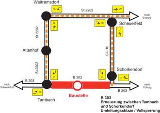 Der Verkehr in Fahrtrichtung Schweinfurt wird von der B 303 über die Kreisstraße CO 16 und die Staatsstraße 2202 Weitramsdorf – Tambach umgeleitet. Der Verkehr in Fahrtrichtung Coburg wird über die Staatsstraße 2202 umgeleitet. Die Umleitungsstrecken sind entsprechend ausgeschildert.