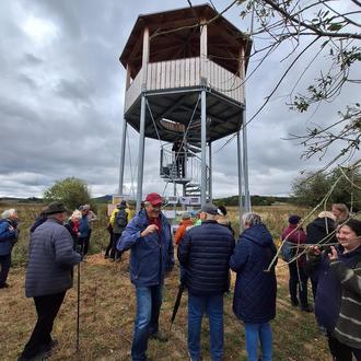Inzwischen nahmen an den Stationen unterwegs weitere Akteure ihre Positionen ein: Am Beobachtungsturm in der Bischofsau war es Peggy Stöber, die Gebietsbetreuerin am Grünen Band für die Stiftung Naturschutz Thüringen. Sie erläuterte den Gruppen das Naturschutzprojekt des "Zweckverbandes Naturschutzgroßprojekt Grünes Band Rodachtal - Lange Berge - Steinachtal" und wie dort Konikpferde und Heckrinder bei der Pflege wertvoller Naturräume helfen.