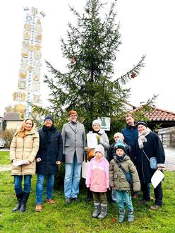 Weitramsdorf – Auf reges Interesse stieß der Namensfindungswettbewerb für den Christbaum in der Ortsmitte der Gemeinde. 26 Einsendungen mit fantasievollen Bezeichnungen reichten Weitramsdorfer Kindergartenkinder sowie Schülerinnen und Schüler bis zwölf Jahren ein, die von dem Journalisten Christian Göller von der Schreibwerkstatt Plus juriert wurden: „Nadeline“ heißt seit Freitagnachmittag nun der stolze Baum, den bereits im zweiten Jahr ein Namensschild ziert, gestiftet von Kerstin Baumann-Franz von der Firma W. und K. Baumann KG. Der Baum wiederum ist eine Spende von Michael Rädlein von der Weidacher Firma Brennholz Rädlein, der das schöne Exemplar aus seinem Besitz bereitstellte. Marie Escher und Kerem Ergöz hatten beide den gleichen originellen Einfall für die Namensgebung des Baumes. Bei der Baumtaufe war allerdings nur Marie Escher anwesend. Ihre Kreativität wurde mit einer kleinen Anerkennung von Bürgermeister Hans Steinfelder belohnt. Zwei Lobgedichte hatten Willemina Preiß und Cornelia Rossberg von der Weitramsdorfer Schreibwerkstatt Plus verfasst, die sie vor der kleinen Feiergemeinde zum Vortrag brachten. Auch nächstes Jahr soll es wieder eine Baumtaufe in Weitramsdorf geben.
