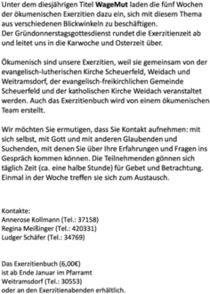 | 19.30 Uhr | Ökum. Alltagsexerzitien "WageMut" - Grund zum Mut |