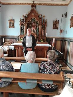 Das besondere Highlight war die Führung von Kirchenpfleger Siegfried Karner durch die Räume des Klosters und die Besichtigung der neu renovierten Klosterkapelle. Dabei erklärte Karner nicht nur die Geschichte des Klosters, sondern auch die verschiedenen Kunstwerke der Kapelle. „Die Ausstattung der Kapelle ist von einmaliger Schönheit und handwerklicher Qualität. In kunsthistorischer Hinsicht ist es eine Mischung aus Neubarock und Nazarener-Stil. Wenn man die Einzelheiten an den Schnitzwerken und Verzierungen genau betrachtet erkennt man erst, mit wieviel Liebe zum Detail der Altar und der Kreuzweg geschaffen wurde“, so Karner. Die Teilnehmer*innen zeigten sich begeistert von der Führung, stellten einige Fragen und erinnerten sich an frühere Zeiten.