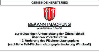 Die Gemeinde Heretsried hat in der Sitzung vom 23.01.2023 gemäß § 2 Abs. 1 BauGB die Aufstellung der 10. Änderung des Flächennutzungsplans (sachliche Teil - Flächennutzungsplanänderung Windkraft) beschlossen.