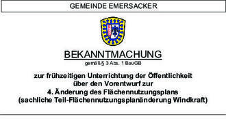 Die Gemeinde Emersacker hat in der Sitzung vom 30.01.2023 gemäß § 2 Abs. 1 BauGB die Aufstellung der 4. Änderung des Flächennutzungsplans (sachliche Teil-Flächennutzungsplanänderung Windkraft) beschlossen.