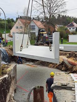 Anschließend erfolgte der vollständige Abbruch der alten, baufälligen Brücke. Die Vorbereitungen für den Einbau der neuen Brückenteile liefen planmäßig – und am 16. April war es schließlich so weit: Die neuen Fertigbetonteile wurden angeliefert. Aufgrund ihrer Größe und des Gewichts kamen einige der Elemente per Spezialtransport zur Baustelle. Mithilfe eines 200-Tonnen-Autokrans wurden die Bauteile präzise auf das vorbereitete Fundament gesetzt.
