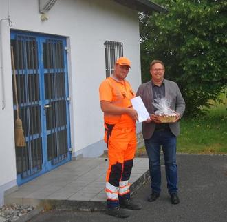 Die Fachkraft für Wasserversorgungstechnik sorgt dafür, dass jederzeit hygienisch einwandfreies Trinkwasser aus der Leitung kommt. Dazu betreiben sie Anlagen zur Gewinnung von geeignetem Rohwasser. Auch die Speicherung in Hochbehältern und Abgabe in das Leitungsnetz gehören zu ihren Aufgaben. Sie legen Rohrleitungen, montieren oder demontieren entsprechende Anlagen und führen Wartungs- und Reparaturarbeiten aus. Bei Störungen greifen sie eigenständig ein. Sie entnehmen Proben, prüfen die Wasserqualität und dokumentieren ihre Arbeitsergebnisse. Herr Andre Kohl absolvierte erfolgreich die Abschlussprüfung zur Fachkraft für Wasserversorgungstechnik. Während der Ausbildung absolvierte er auch die Elektrofachkraft für festgelegte Tätigkeiten. Bürgermeister Stefan Scheider beglückwünschte André Kohl zur bestandenen Prüfung und überreichte ihm verbunden mit einem Geschenk das Abschlusszeugnis. Der Markt Welden ist nun neben dem Wasserwart mit einer weiteren Fachkraft in der Wasserversorgungstechnik gut aufgestellt.