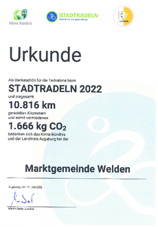 Die Marktgemeinde Welden nahm an der Aktion „Stadtradeln 2022“ des Landkreises Augsburg teil. Insgesamt wurden in der Marktgemeinde Welden 10.816 km geradelt und somit 1.666 kg CO2 vermieden.