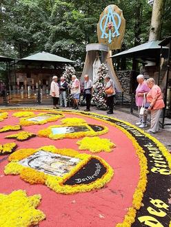 Der diesjährige Blumenteppich mit einigen Besucher*innen aus Emersacker.