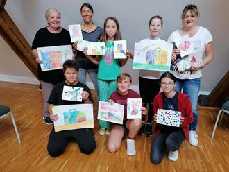 Unter dem Motto „Malen kann jeder – Malen macht glücklich“ lernten zwölf kleine und große Künstlerinnen und Künstler an einem ziemlich verregneten Nachmittag im Schloss in Emersacker Aquarellfarben kennen. Um die Technik kennenzulernen, wurde ein Melonenstück gemalt. Danach durfte sich jeder an einem eignen Motiv ausprobieren – Urlaubskoffer, Quallen, Robben, Katzen und mehr landeten auf dem Papier. Den letzten Pfiff bekamen die Kunstwerke mit schwarzen und weißen Finelinern. Und es wurde klar: Auch ich kann malen, denn jedem Teilnehmer war am Ende ein tolles Bild gelungen. Zu hoffen ist, dass die Begeisterung mit nach Hause genommen wurde, denn Malen entspannt und macht den Kopf frei – es macht einfach glücklich!