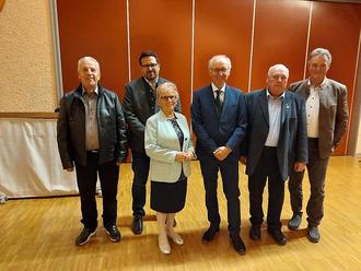 Die Gratulanten von rechts Altbürgermeister Michael Müller, Manfred Gerblinger, Pfarrer Mate Cilic, Roswitha Felber, Bürgermeister Karl-Heinz Mengele und Altbürgermeister Alois Heim.