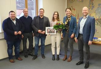 Bürgermeister Bernhard, Vereinskoordinator Schmied, stellv. Vorsitzender Scheider, Regionalmanagerin Hummel und Vorsitzender Mair verabschiedenden Alena vergangene Woche im Rahmen eines Umtrunks in der VGem. Welden