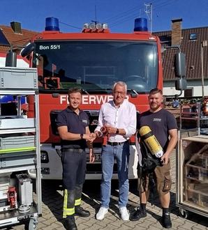 Bei der Übergabe von Rollwagen und Brandhaus (vlnr) Christian Deil (1. Kommandant), Anton Gleich und Martin Streil (1. Vorstand des Feuerwehrvereins)