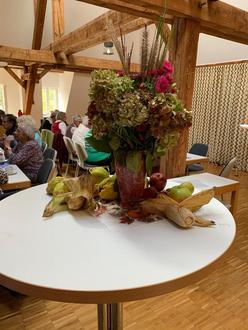 Der Saal war passend zum Motto dekoriert, mit blau-weißen Tischdecken und herbstlichen Blumenarrangements, die für eine gemütliche Atmosphäre sorgten. Bei frischem Kaffee und leckerem Kuchen kam schnell gute Stimmung auf, und die Gäste tauschten sich bei netten Gesprächen aus.