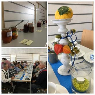 Mit den Klängen zünftiger Blasmusik wurden unsere Gäste empfangen. Die reichliche Beerenernte in diesem Jahr schlug sich in den 22 mitgebrachten Marmeladen und Kuvertüren nieder. Von Brombeeren, Quitten, Josta/Heidelbeeren, Aprikosen, Glühwein-Apfel, Himbeer-Melone, Mirabelle, Stachelbeere ... war alles dabei. Hierzu gab es Hefegebäck aus den verschiedenen Backstuben. Zu den Musikstücken wurden Liedzettel ausgeteilt und so fingen wir gleich mit dem Bozener Bergsteigermarsch an, den wir mit Gesang, Bewegung und Klatschen begleiteten. Zwischen den Liedern ließen wir Georg Ried mit seinen Gedanken zur Blasmusik, Heimat und Evolution der Musik zu Wort kommen. Nachdem wir mit dem Lied „Auf die Vogelwiese ging der Franz“ an unseren Franz Nachtmann gedacht hatten, ließen wir auch Franzl Lang mit seinen Jodlern aufleben. Hierzu erzählte uns Erich Lachenmayr eine wahre Geschichte um Franzl Lang.