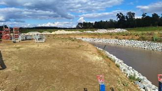 Bauarbeiten am Damm des Rückhalts Siefenwang. Für die Einlassstelle des Beckens, musste die Zusam umgeleitet werden.
