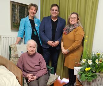 von links nach rechts: Leitung soziale Betreuung Carmen Girstenbrei, Bürgermeister Stefan Scheider, Einrichtungsleitung Michaela Schuster gratulieren Frau Maria Graml zum 100. Geburtstag.
