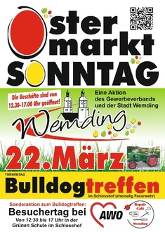 Jedes Jahr steht der Marktsonntag unter einem anderen Motto. In diesem Jahr lädt der Gewerbeverband zum zweiten Mal zu einem Bulldogtreffen, nachdem die Aktion im Vorjahr sehr gut angenommen wurde. Im Schlosshof entsteht eine Schaufläche für Traktoren aller Art. „Rund 70 Bulldogs und Fahrzeuge jeglichen Alters waren letztes Jahr ein großer Besuchermagnet - das ist natürlich für Klein und Groß eine Attraktion.“ Kurzfristig Interessierte finden weitere Informationen unter www.wemding.de/gewerbverband oder erhalten sie unter Tel. 09092/9690-35. Die An- und Abfahrt erfolgt von 12:30 Uhr bis 17 Uhr eigenständig und ausschließlich über die Mangoldstraße. Die Anzahl der vor Ort anwesenden Bulldogs variiert den ganzen Nachmittag.