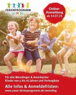 Vom 14.07.2025 bis einschließlich 17.07.2025 können sich die Kinder aus Wemding, Amerbach und Kreut für das Ferienprogramm anmelden. Im Anschluss daran findet die Verlosung der Teilnahmeplätze statt. Eine spätere Anmeldung ist ebenfalls möglich; allerdings erfolgt dann die Platzvergabe nach dem Eingang der Anmeldung.