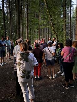 Angekommen im kühlen Stadtwald wurde es mystisch, denn ab hier ging es in die Sagen- und Legendenwelt von Wemding. So hatte gar das verhinderte Huaderle, die wohl bekannteste Sagengestalt der Wemdinger, einen kleinen Umtrunk für die Gruppe versteckt, um die Besucher aber nach dem Genuss, rasch aus seinem Wald hinauszuschicken. Nur noch wenig Dämmerungslicht zeigte den Interessierten den Weg und plötzlich, wie von Zauberhand, erhellten tausende von Glühwürmchen am Wegesrand, den Weg zurück zum See. Karl-Heinz John versicherte glaubwürdig, dass dies natürlich so vorab, beim Huaderle und den drei weißen Nonnen, bestellt wurde.