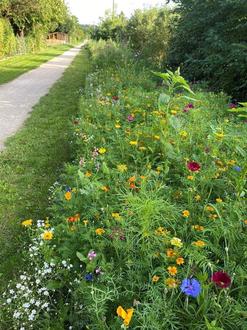 Entlang des ehemaligen Bahndamms wurde auf Initiative von Umweltreferent Johannes Vogel und Bürgermeister Dr. Martin Drexler ein langgezogener Blühstreifen errichtet. Seit kurzem zeigen sich die Blüten und Knospen in voller Farbenpracht.