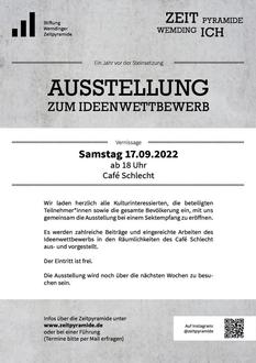 Rund ein Jahr vor der vierten Steinsetzung der Zeitpyramide auf der Wemdinger Platte im Herbst 2023 lädt die Stiftung Wemdinger Zeitpyramide zu einer Vernissage am Samstag, den 17.09.2022 um 18 Uhr ein. Es werden zahlreiche Beiträge und eingereichte Arbeiten des in den letzten Wochen und Monaten stattgefundenen Ideenwettbewerbs in den Räumlichkeiten des Café Schlecht ausgestellt.