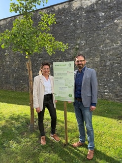 Bürgermeister Dr. Martin Drexler freut sich gemeinsam mit Initiatorin Carolin Mayer über das neue Angebot in Wemding. Der Startpunkt wurde unmittelbar an einem Ginkgo-Baum gewählt – dem Symbol für Vitalität und positive Energie.