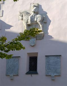 Erst spät hat die Gemeinde ihren gefallenen Söhnen ein Denkmal am südlichen Pfarrkirchturm unter Mitwirkung ihres großen Gönners Stadtpfarrer Lederer im Jahre 1926 gesetzt und am 10.Okt.1926 eingeweiht und enthüllt. Es stellt einen heimkehrenden Reiter dar, der hoch auf trauerndem Rosse mit entblößtem Haupte betet in Trauer und Wehmut um die Gefallenen. Zu beiden Seiten sind zwei steinerne Tafeln mit den Namen der Gefallenen. R. I. P.