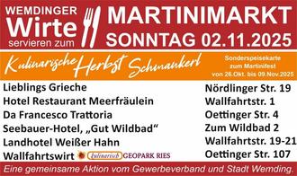 Genuss und Gaumenfreude sind bei den Wemdinger Wirten bei den Aktionswochen zum „Kulinarischen Herbst“ vom 26.10. bis 09.11. angesagt. Mit einer eigenen „Martini-Speisekarte“ wollen sie Leckeres aus der Herbstküche darbieten (Tischreservierung empfehlenswert). Wer eine kleine Pause vom Marktgeschehen einlegen möchte und ein Ziel für die Familie sucht, den lädt der Gewerbeverband Wemding zum „Marktkino“ ein und bietet dabei in Kooperation mit dem Kino-Lichtspiele Wemding einen reduzierten Marktpreis an. Am Marktsonntag wird um 14 Uhr der Film „TAFITI - Ab durch die Wüste" (Dauer 80 Min., FSK 0 Jahre) gezeigt. Der deutsche Animationsfilm der Regisseurin Nina Wels aus dem Jahr 2025 basiert auf der beliebten Kinderbuchreihe von Julia Boehme und Julia Ginsbach. In der Savanne Afrikas wagt Erdmännchen Tafiti sein größtes Abenteuer. Gemeinsam mit Pinselohrschwein Pinsel entdeckt er Mut, Freundschaft und die Magie, füreinander da zu sein. Tickets zum ermäßigten Markt-Preis von 6 €/Person gibt es im Online-Vorverkauf (www.kino-wemding.de) oder am Marktsonntag direkt vor Ort (solange Plätze verfügbar).