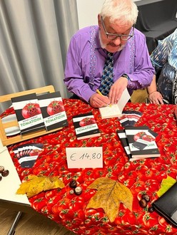 Nach der unterhaltsamen Lesung signierte der Autor Michael J. Scheidle aus Bopfingen für unsere Leser sein erstes Buch „Tomatidin“.