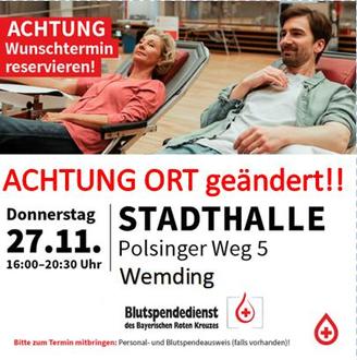 Der Termin zur Blutspende findet nicht wie ursprünglich angekündigt in der Leonhart-Fuchs-Grund- und Mittelschule Wemding statt.