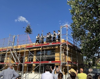 Ende April konnte das Richtfest begangen werden. Im Jahresverlauf folgten die Fertigstellung des Daches und Außenputzes sowie der Innenausbau.