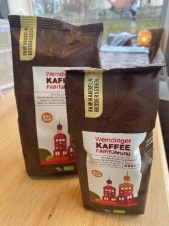 Die Steuerungsgruppe „Fairtradestadt Wemding“ und die Stadt Wemding sind sehr erfreut, dass die neue eigene Kaffeekreation so gut ankommt. Vor allem als Geschenk wird sie derzeit gerne für Weihnachten gekauft. Auf dem Foto sehen Sie die beiden erhältlichen Größen abgebildet: