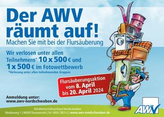 gerade jetzt, wo die Hecken an den Wegrändern zurückgeschnitten sind, sieht man, dass sich leider wieder viel Müll und Unrat in der Flur angesammelt hat. Dieses Jahr startet am 20.04.2024 die Aktion „Der AWV räumt auf“. Gerne laden wir alle Vereine, Schulklassen aber auch Privatpersonen dazu ein, gemeinsam die Flur um Wemding und Amerbach von Unrat und Müll zu säubern. Alle Vereine und Schulklassen, die sich vorher telefonisch 0906-78030 oder über das Onlineformular registriert haben, nehmen an einer Verlosung von zehnmal 500 € teil.
