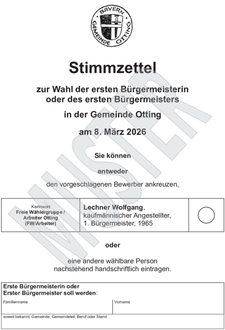 | 2.1.1 | Die Gemeinde Otting ist in 1 allgemeinen Stimmbezirk eingeteilt.In den Wahlbenachrichtigungen, die den Wahlberechtigten bis spätestens 15. Februar 2026 (21. Tag vor dem Wahltag) übersandt worden sind, sind der Stimmbezirk und der Abstimmungsraum angegeben, in dem die Stimmberechtigten abstimmen können. Sie enthalten einen Hinweis, ob der Abstimmungsraum barrierefrei ist. | |