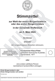 | Gewählt wird mit amtlich hergestellten Stimmzetteln. Sie sind als Muster anschließend an diese Bekanntmachung abgedruckt bzw. in der VG Wemding ausgehängt (Landrat und Kreistag). Gegebenenfalls aufgedruckte Strichcodes dienen ausschließlich der Erleichterung der Stimmenauszählung. | |