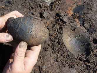 Gefäßfragment im Bergungszustand auf der Grabung Werneck-Spitzäcker. F.: Ausgrabungen Specht, Schwebheim