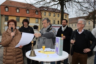 Mit einer ehrwürdigen Glocke aus dem Rathaus und der anschließenden Urkundenverlesung wurde das Jubiläumsjahr von Bürgermeisterin a.D. Edeltraud Baumgartl (links) und ihrem Organisationsteam gebührend eingeleitet. Neben ihr auf dem Foto (v.l.n.r.:) Marktgemeinderat Johannes Weiß, Bernd Göbel, Vorsitzender des Historischen Vereins, Sebastian Hauck, 1. Bürgermeister des Marktes Werneck und Rainer Klingert vom Organisationsteam.