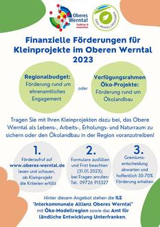 Bis zum 31. Januar 2023 können Anträge im Rahmen von zwei Förderprogrammen für Kleinprojekte eingereicht werden: Regionalbudget und Verfügungsrahmen Öko-Projekte. Weitere Informationen, Ansprechpartner und Formulare finden Interessierte unter www.oberes-werntal.de.
