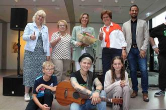 Ein Konzert, das begeisterte: (hintere Reihe v. l.) Rektorin Katrin Beinrott, Annemarie Schuler (2. Vorsitzende des Fördervereins), Tanja Hochrein (Konrektorin), Bürgermeisterin a. D. Edeltraud Baumgartl (1. Vorsitzende des Fördervereins) und Bürgermeister Sebastian Hauck (Vorsitzender des Schulverband), sowie vorne die Schüler Fabian Gloss und Olivia Fink mit Steffi List (Band DLL).