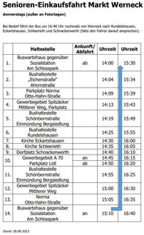 Die Route von Werneck in die Einkaufsgebiete und zurück dauert etwa 70 Minuten und wird zweimal gefahren (14:00 Uhr und 15:30 Uhr). Letzte Rückfahrt aus dem Gewerbegebiet A70 ist um 16:20 Uhr. Sollten bei dieser letzten Fahrt Mitfahrer aus Schnackenwerth, Schleerieth, Eckartshausen oder Rundelshausen an der A70 zusteigen, fährt der Bus die entsprechenden Ortsteile nochmals an. Bitte teilen Sie dies dem Fahrer beim Zusteigen mit.