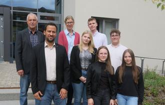 im Bild von links hinten: Konrad Bonengel, Geschäftsleiter Werneck, Eva Fenn, ILE Umsetzungsbegleitung, Leon Naujoks, Niederwerrn, Mitte: Sebastian Hauck, 1. Bürgermeister, Magdalena Göbel, Geldersheim, Niklas Johannydes, Poppenhausen, vorne: Leona Mansius, Dittelbrunn, Michelle Wischer, Markt Werneck