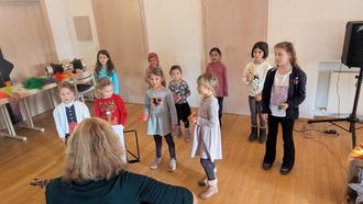 Für den musikalischen Teil des Programms sorgte der Kinderchor unter der Leitung von Mariann Maas. Mit viel Freude trugen die Kinder verschiedene Lieder zur Advents- und Winterzeit vor. Natürlich durfte dabei das Lied von der „Weihnachtsbäckerei“ nicht fehlen. Auch Frau Holle wurde fleißig besungen – schließlich sollte es an Weihnachten ja schneien. Für so viel Freude am Singen wurden die Sängerinnen und ihre Chorleiterin am Ende des Auftritts mit langanhaltendem Applaus belohnt.