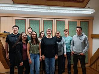 Die neue Vorstandschaft v.l.n.r.: Beisitzer Christian Heim, Jugendwart Michaela Sattelberger, 1. Vorstand Peter Guggemos, 1. Schriftführerin Julia Neuhauser, Trachtenwart Stefanie Kleinheinz, 1. Kassiererin Bianca Knoll, 1. Dirigentin Petra Huber, Noten- und Gerätewart Martin Guggemos, 2. Vorstand Laurin Knoll