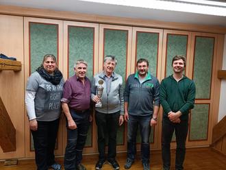 Pokalübergabe v.l.n.r.: 1. Dirigentin Petra Huber, 3. Platz Georg Stokklauser, 1. Platz Josef Heim, 3. Platz Gerhard Huber, 1. Vorstand Peter Guggemos, nicht auf dem Bild: 2. Platz Robert Mungenast